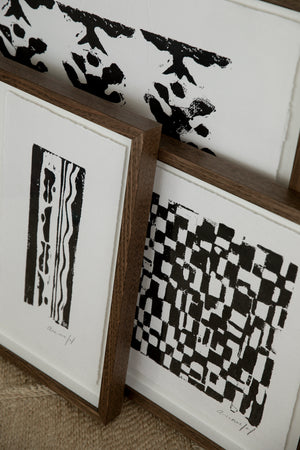 Created in our Cudgen studio as a joint project between Australian artist Rikki Day and Australian photographer Tess Leopold. These works explore the technique of lino printing, where we first carved the artwork into a piece of artists lino or a carving block. An ink or in our case acrylic paint is lathered upon the block and it is pressed onto a cotton paper to make the mark of the carved work. We feel a deep connection to this process as we believe it's beauty comes from the visual play between dark space and light space. With one unable to exist with out the other a lot like a metaphor for life.