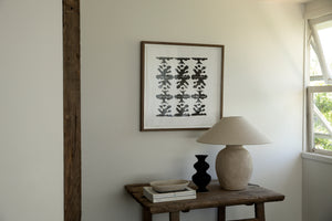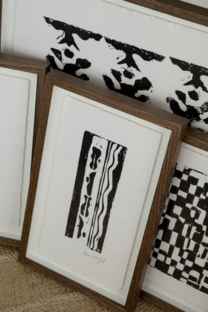 Created in our Cudgen studio as a joint project between Australian artist Rikki Day and Australian photographer Tess Leopold. These works explore the technique of lino printing, where we first carved the artwork into a piece of artists lino or a carving block. An ink or in our case acrylic paint is lathered upon the block and it is pressed onto a cotton paper to make the mark of the carved work. We feel a deep connection to this process as we believe it's beauty comes from the visual play between dark space and light space. With one unable to exist with out the other a lot like a metaphor for life.
